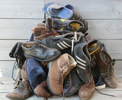 Het is mooi weer vandaag en ik wil de was buiten ophangen. Ik wil de wasmand pakken en tsja, daar liggen al die schoenen nog in. Ik twijfel even of ik ze niet gewoon terug in de kast leg; misschien is het gewoon nog te vroeg om ze weg te gooien. Nee, ik krijg ineens een idee.
