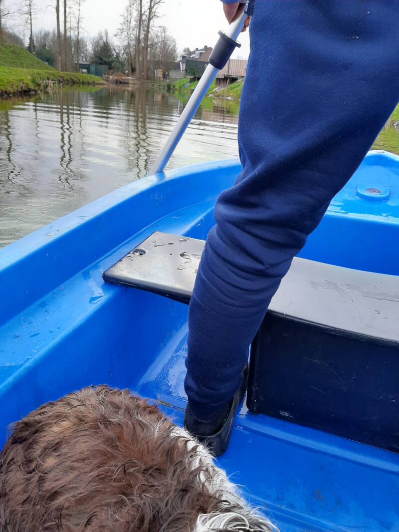 Nog even gecheckt of ze inmiddels voor de deur stond, maar nee. Verder met mijn verslag. De telefoon gaat. Het is Roy. Hee mam, waar is Izzy? In het weiland zei ik. Oh dan is ze het toch op Dorpsberaad. Dat is een facebookgroep van de bewoners in ons durpie. Ik kijk en jawel hoor; Izzy nog steeds op het eiland. Er was een dame onderweg met een bootje. Dus ik dacht: ik loop er maar even heen, want Izzy vindt vreemden eng. Op het eiland zie ik Izzy staan, druk blaffend en heen en weer rennend; een mevrouw die probeerde haar te lokken. Oh ja, dat eiland: dat is een gezamenlijk stuk privé land, eigendom van mensen in een straat achter hun huis; omringd door water dus. Een andere mevrouw vaarde in een bootje en ik had me inmiddels gemeld via Facebook en live. Instappen in het bootje viel niet mee, dus gelopen naar het huis waar een steiger was. Toen viel het nog niet mee, maar ik viel niet in de plomp. Overgevaren naar het eilandje, weer met gevaar van een onverwachte zwemles mijnerzijds uit het bootje. De doodsbange Izzy in de boot getrokken; weer in het bootje, overvaren, en daar werd ik door een vriendelijke mevrouw uit de boot geholpen. Eerst Izzy en die werd met riem en al afgegeven aan de heer des huizes, die in een keurig zwart pak liep. Fijn zo'n blubberige hond in de buurt van een keurig geklede manier. Ik stamelde wat excuses en klom behendig (ik had inmiddels ervaring) uit de boot. Pffff. En eindelijk naar huis. Kobus blij, ik blij en Izzy was erg moe.