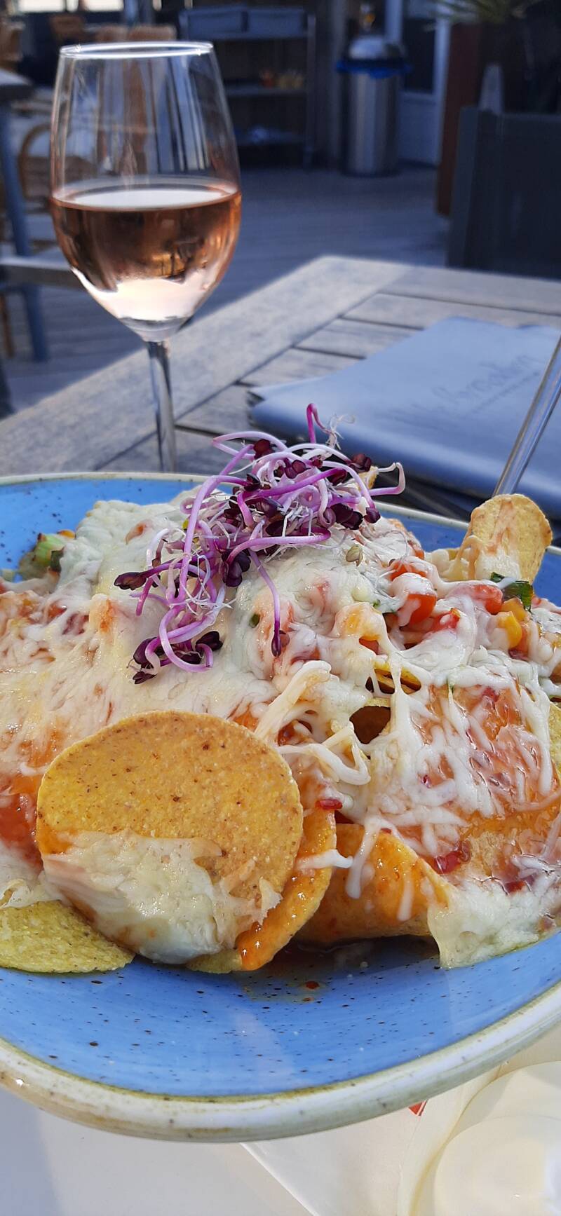 Dingen waar ik geen invloed op heb, daar maak ik me niet meer druk over. Ik ga gewoon naar een strandtent. Het zonnetje schijnt, de lucht is blauw, Deanne ga maar gauw! Die Teletubbies waren zo gek nog niet. Terwijl ik naar de strandopgang loop, word ik gespit door dorpsgenoten. Haha hoe toevallig! We wisten via anderen dat we tegelijkertijd op Terschelling zouden zijn, maar elkaar dan toch tegen het lijf lopen. Ik bestel een rosé en de nachos met allerlei lekkers.